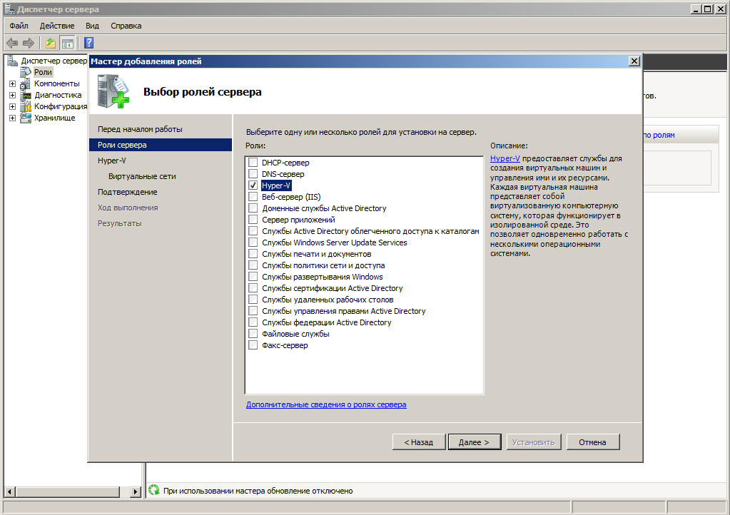 Установка Hyper-V как роли ничем не отличается от установки иных ролей Windows Server. Также выбираем оснастку Роли в Диспетчере сервера и запускаем Мастер добавления ролей.