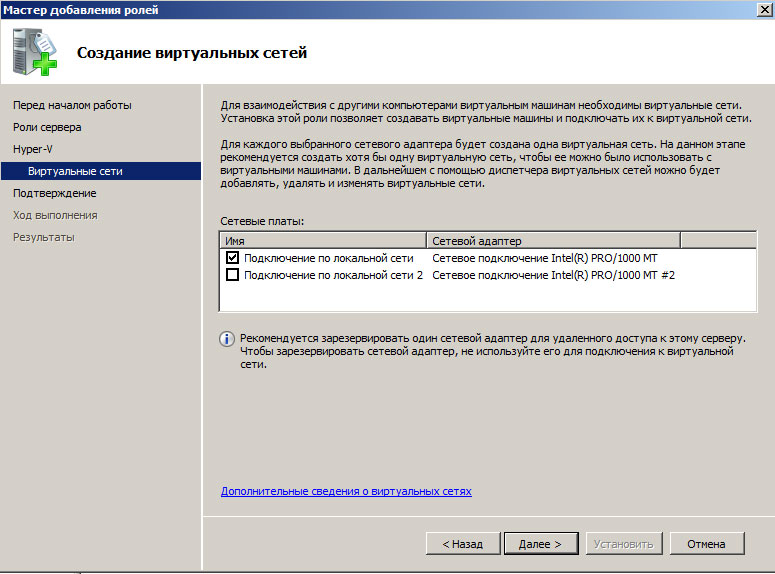 Выбираем роль Hyper-V и нажимаем Далее. Следующим шагом нам будет предложено создать виртуальные сети. В Hyper-V виртуальная сеть представляет собой виртуальный коммутатор к которому подключаются виртуальные машины, с внешним миром такой коммутатор может быть соединен посредством одного из физических сетевых адаптеров хоста.