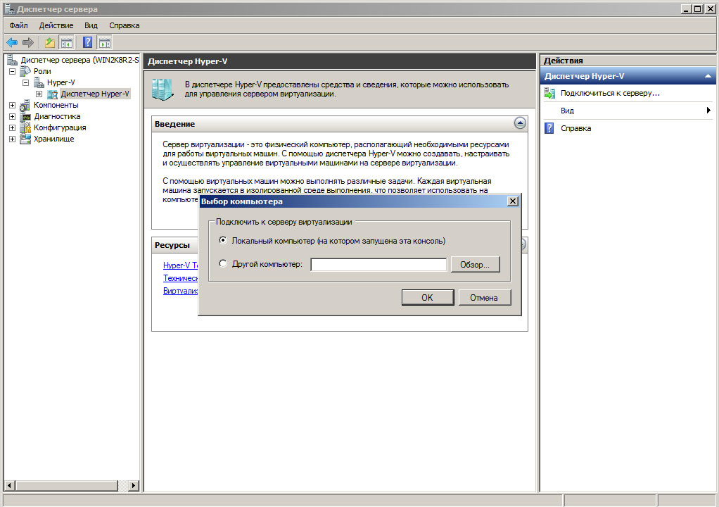 Диспетчер Hyper-V позволяет подключаться как к локальному, так и к удаленным Hyper-V серверам, в данном случае нас интересует подключение к локальному серверу.