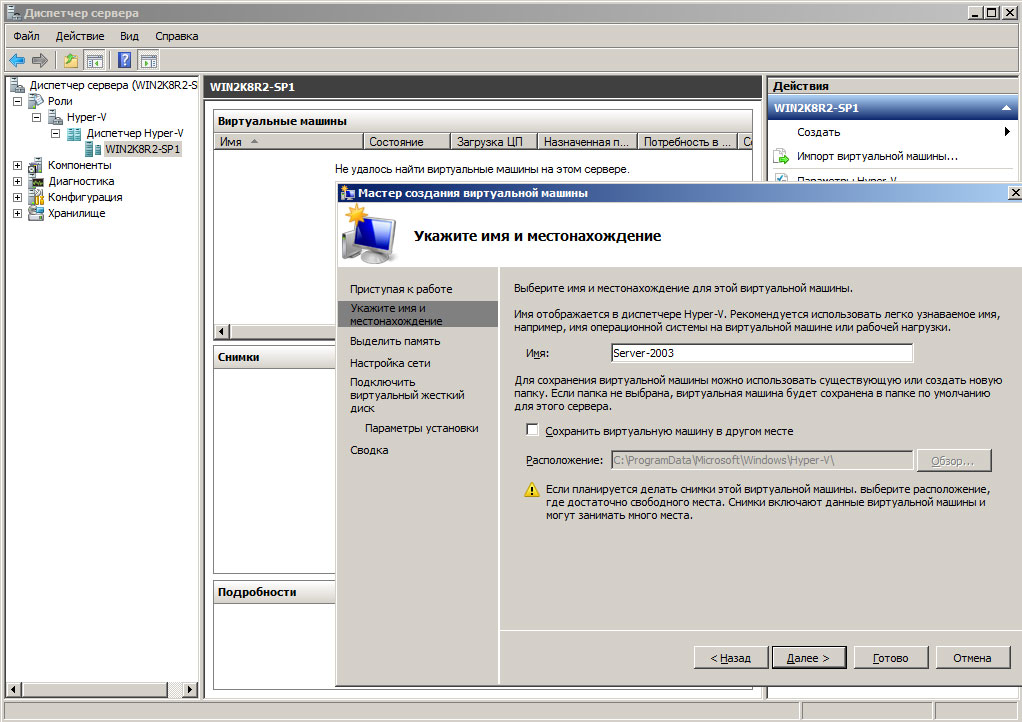 Работа с Hyper-V довольна проста и интуитивно понятна. Для примера создадим виртуальную машину и установим туда Windows Server 2003. Справа вверху в меню Действия выберем Cоздать - Виртуальную машину, запустится соответствующий мастер, который пошагово проведет нас через все необходимые этапы. Прежде всего укажем название и расположение файлов виртуальной машины.