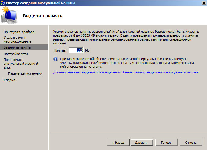 Следующим шагом указываем доступный виртуальной машине объем памяти, исходить тут следует из разумного минимума, так как память выделяется виртуальной машине при запуске сразу в полном объеме. В последующем вы сможете всегда изменить это значение или настроить динамическое выделение памяти, если у виртуальной системы эпизодически будет возникать такая потребность.