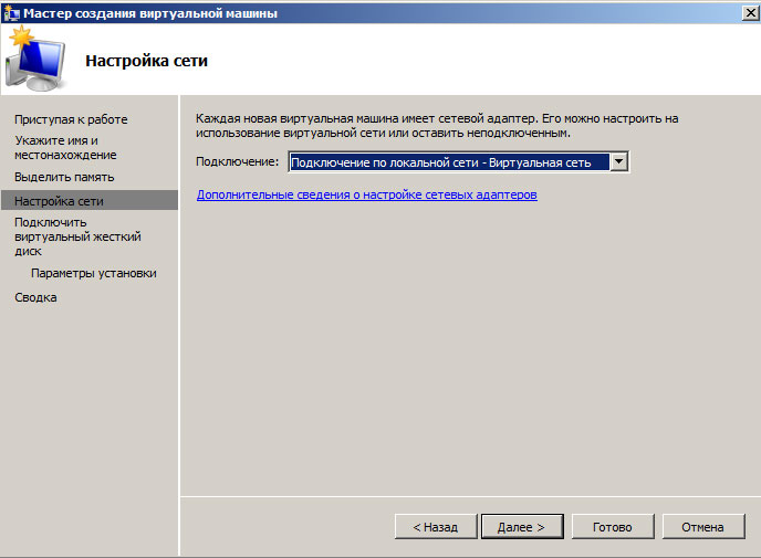 Важно понимать, что в отличие от VMware, Hyper-V не позволяет подключить виртуальный сетевой адаптер непосредственно к внешней сети и вы должны создать виртуальную сеть даже если у вас будет всего одна виртуалка.