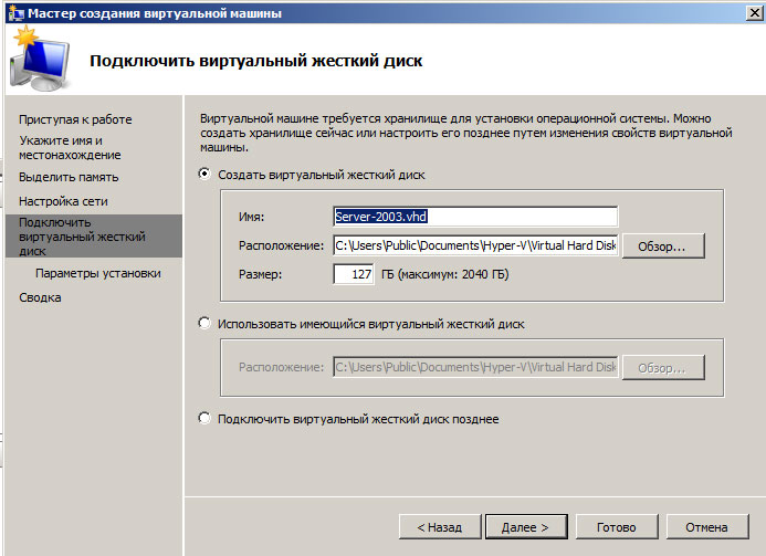 Теперь перейдем к созданию виртуального жесткого диска. Сразу обратим ваше внимание, что расположение файлов виртуальных дисков отличается от файлов виртуальных машин, в реальных условиях располагать виртуальные диски желательно на отдельном производительном массиве, так как производительность дисковой подсистемы оказывает существенное влияние производительность виртуальных машин в целом. В отличие от оперативной памяти, дисковое пространство выделяется динамически, т.е. файл виртуального диска имеет размер равный фактическому размеру расположенных в нем файлов и папок, но не более выделенного значения.