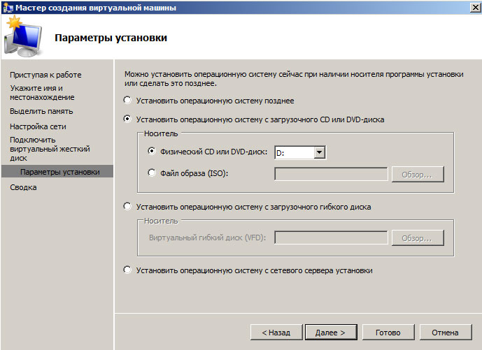 Заключительным шагом будет выбор параметров установки операционной системы, вы можете использовать для этого физический CD-привод хоста или смонтировать ISO-образ, также доступна установка по сети или загрузка с образа жесткого диска.