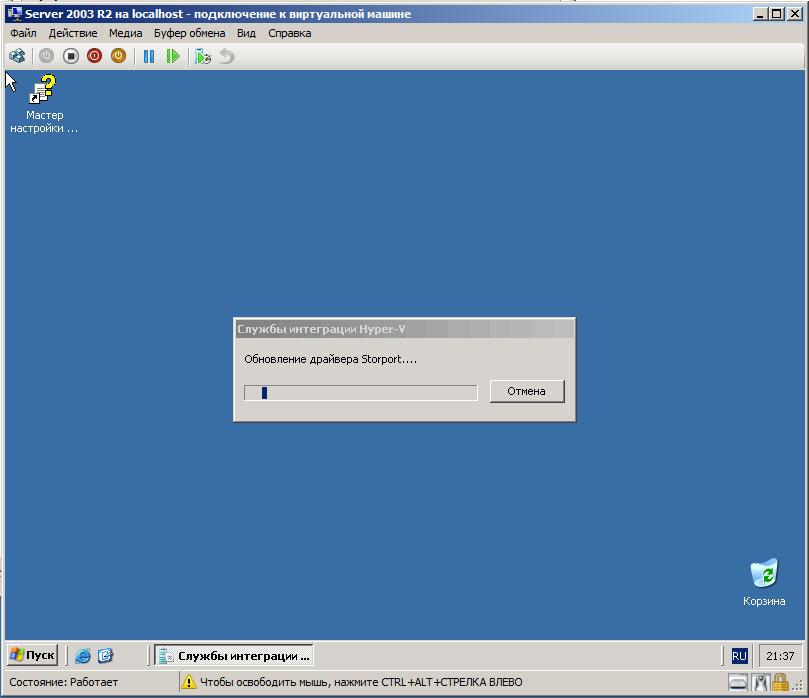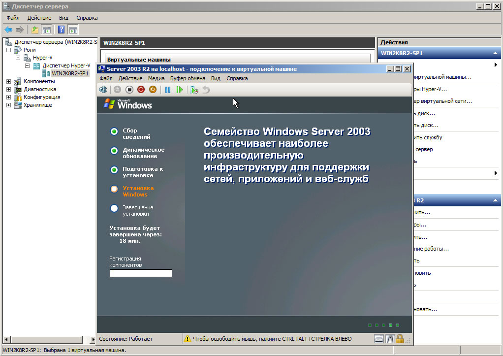 По окончании установки ОС не забудьте установить Службы интеграции Hyper-V, которые необходимы для обеспечения максимальной производительности и корректного взаимодействия виртуальной машины с хостом. Для этого в окне виртуальной машины выберите Действие - Вставьте установочный диск служб интеграции, после чего в дисковод виртуалки будет смонтирован нужный образ и начнется установка.