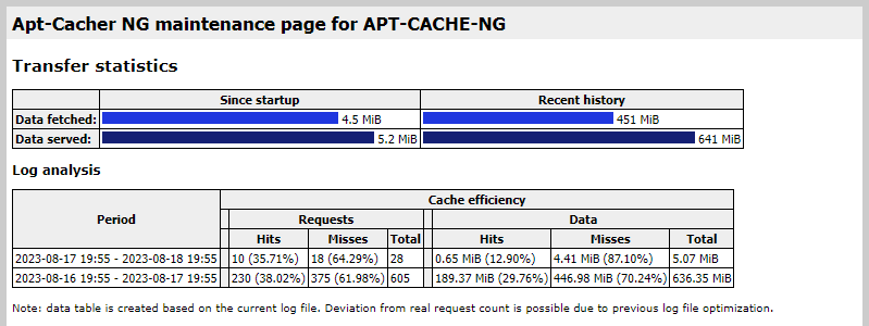 Для контроля и управления кеширующим сервером откройте в браузере адрес: http://192.168.111.72:3142/acng-report.html. Здесь вы можете увидеть статистику, включающую общий объем скачанных пакетов и объем данных отданных локально, а также процент попадания в кеш. Данные выводятся в двух разрезах: со времени последнего запуска службы и за все время.