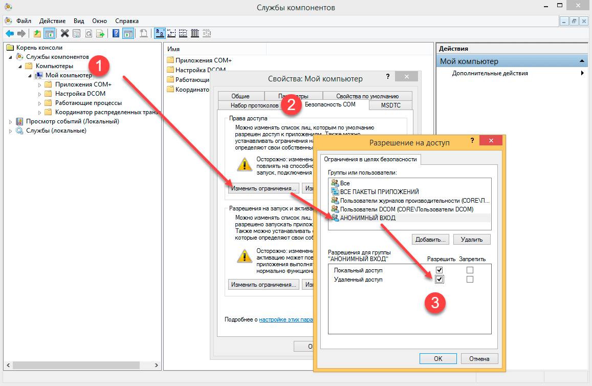 Затем запустите оснастку dcomcnfg, через Win+R или из командной строки, и разверните дерево Службы компонентов - Компьютеры - Мой компьютер. После чего в по щелчку правой кнопки мыши выберите Свойства и перейдите на закладку Безопасность COM - Права доступа - Изменить ограничения и в открывшемся окне установите для пользователя АНОНИМНЫЙ ВХОД права Удаленный доступ.