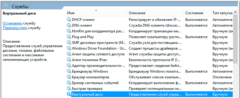 Для того, чтобы использовать оснастку Управление дисками предварительно потребуется запустить службу Виртуальный диск, это можно сделать прямо здесь, через оснастку Службы.