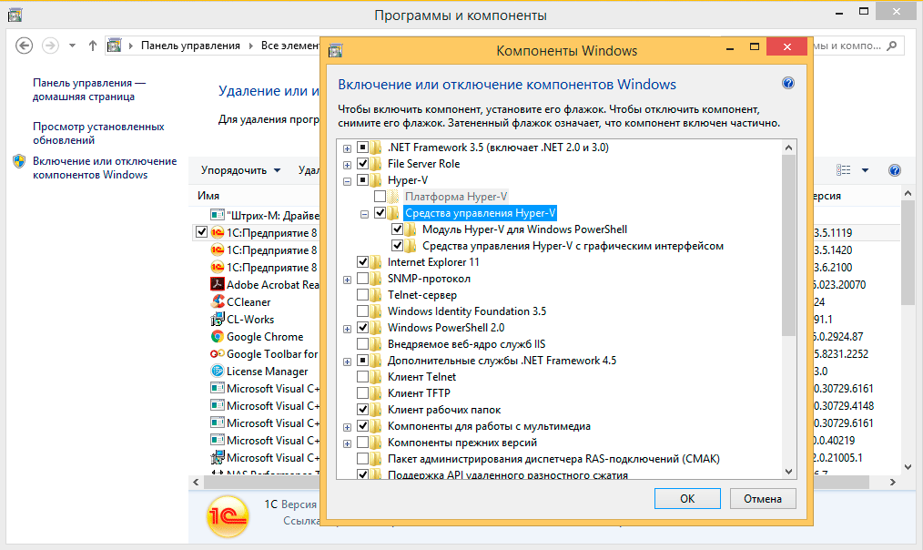 Наконец мы подошли к самому главному. Перейдем в классическую Панель управления - Программы и компоненты - Включение и отключение компонентов Windows и установим Средства управления Hyper-V.