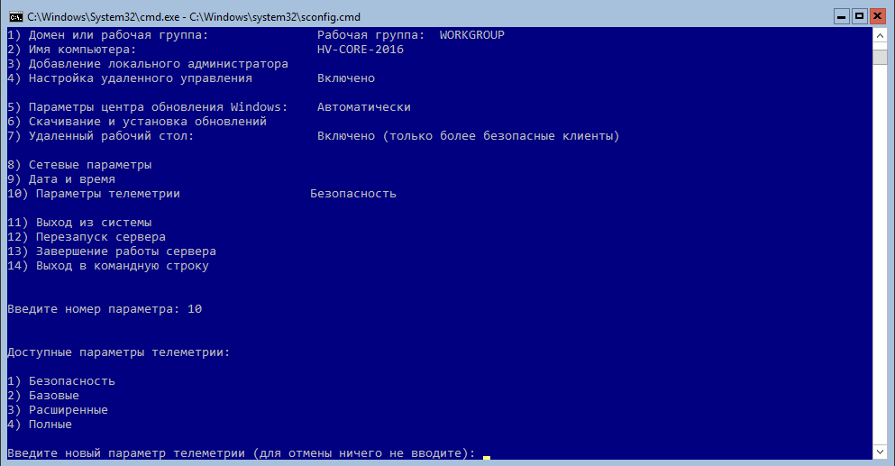 Затем включаем удаленный рабочий стол (пункт 7) и настраиваем сетевые параметры (пункт 8). Отдельным пунктом нас ожидает телеметрия (куда же без нее), полностью отключить ее невозможно, поэтому устанавливаем минимальный уровень - Безопасность.