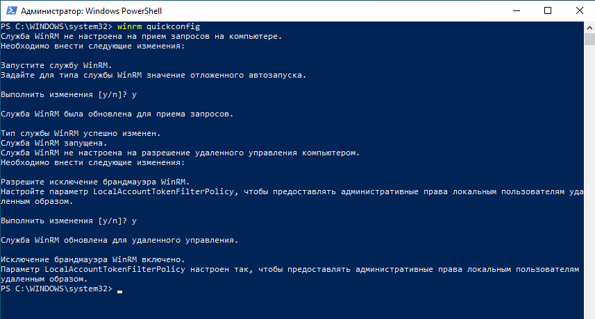 Утвердительно отвечаем на все вопросы, при этом будет настроен автоматический запуск службы WinRM и созданы разрешающие правила в брандмауэре.