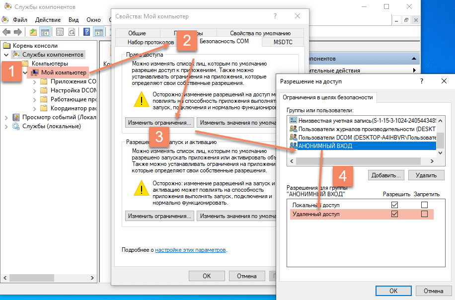 Теперь через командную строку или команду Выполнить (Win + R) запустим оснастку dcomcnfg, в ней разверните дерево Службы компонентов - Компьютеры - Мой компьютер. После чего по щелчку правой кнопки мыши выберите Свойства и перейдите на закладку Безопасность COM - Права доступа - Изменить ограничения и в открывшемся окне установите для пользователя АНОНИМНЫЙ ВХОД права Удаленный доступ.