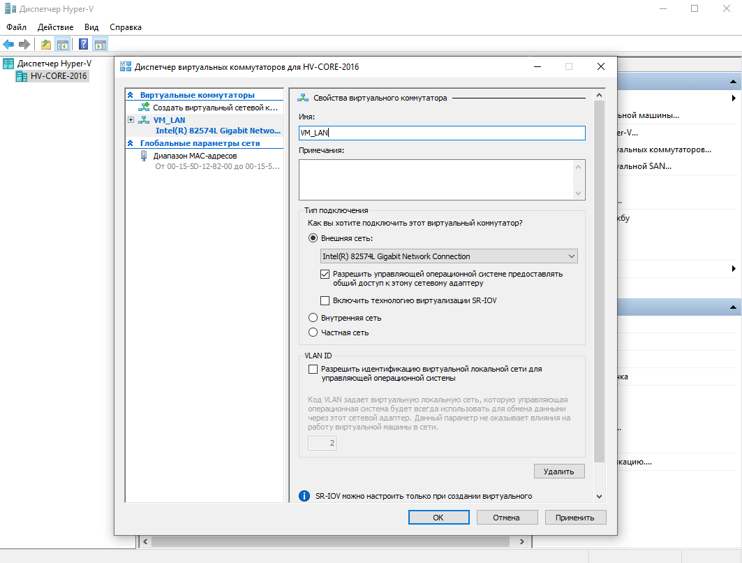 После чего запустим установленную оснастку и подключимся к серверу Hyper-V. В первую очередь обеспечим связь наших виртуальных машин с внешним миром, для этого перейдем в Диспетчер виртуальных коммутаторов и создадим новый коммутатор с типом Внешний и укажем для него ту сетевую карту, которая смотрит в локальную сеть. Более подробно о настройке сети в Hyper-V вы можете прочитать здесь.
