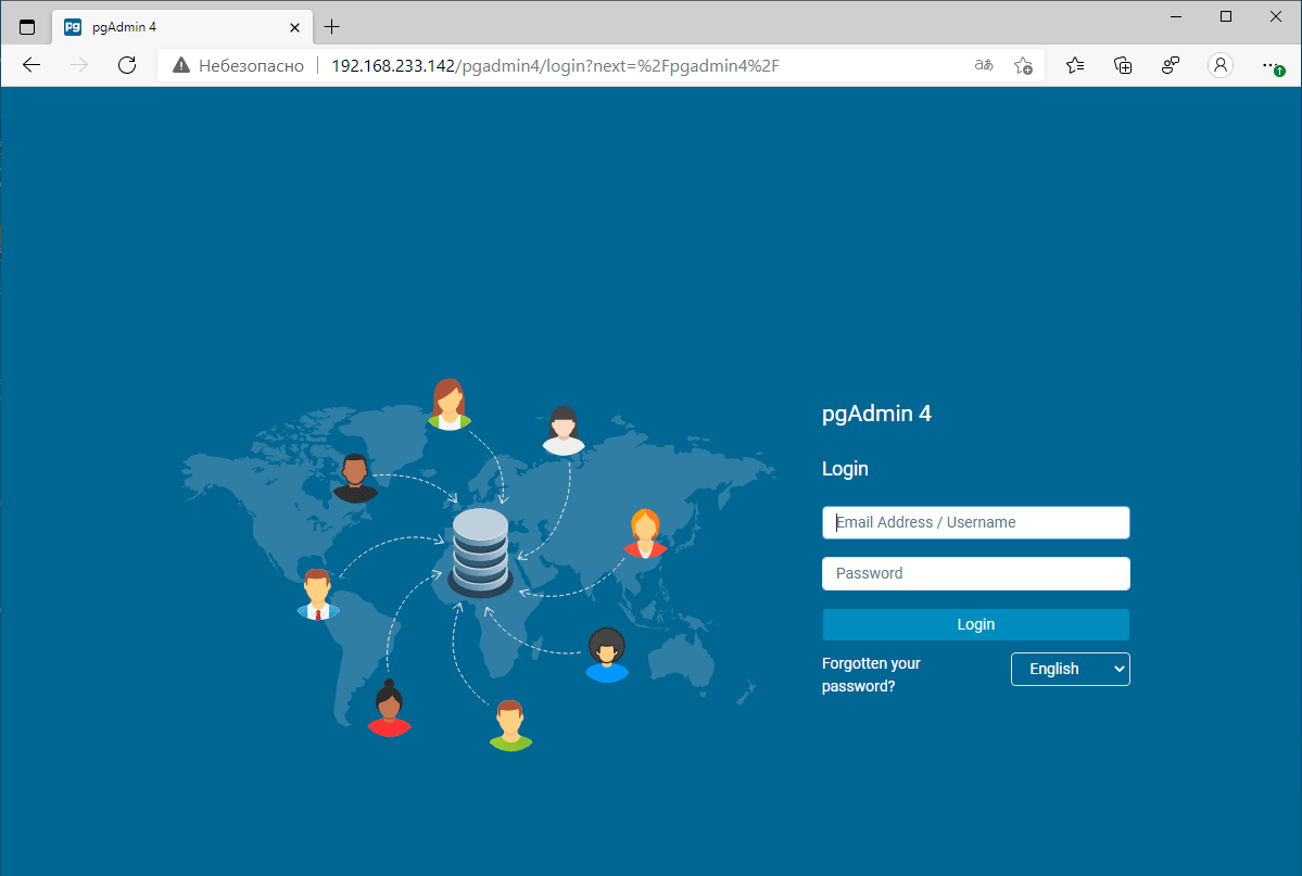 Теперь подключимся к серверу pgAdmin 4 через браузер с явным указанием защищенного протокола https://имя_или_ip_сервера/pgadmin4: