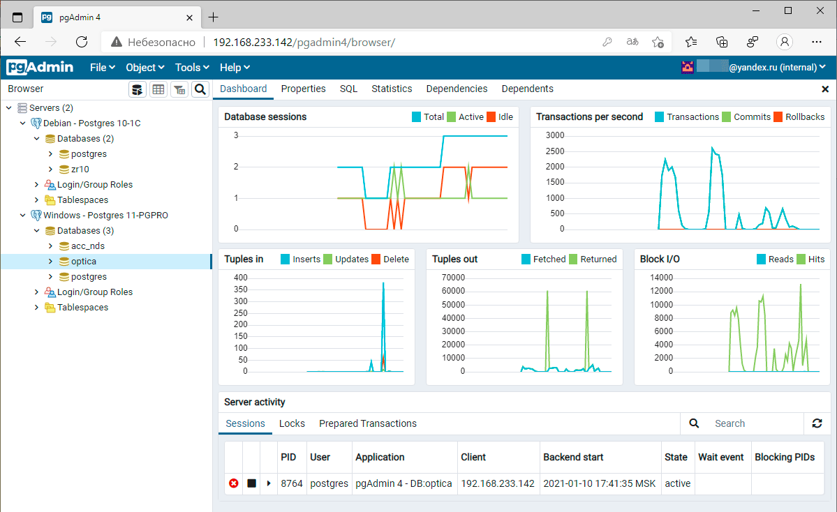 После авторизации вы попадете в привычную среду pgAdmin, можете подключать свои сервера и работать с базами данных. Инструмент поддерживает любые версии PostgreSQL и платформы установки (Windows, Linux и т.п.). В тестовых целях мы подключили сборку PostgreSQL 10 от 1С на платформе Linux и PostgreSQL 11 от Postgres Pro установленную на Windows Server.
