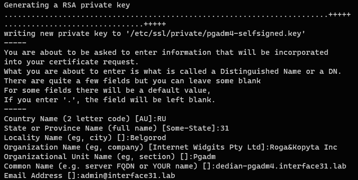 1openssl req -x509 -nodes -days 3650 -newkey rsa:2048 -keyout /etc/ssl/private/pgadm4-selfsigned.key -out /etc/ssl/certs/pgadm4-selfsigned.crt