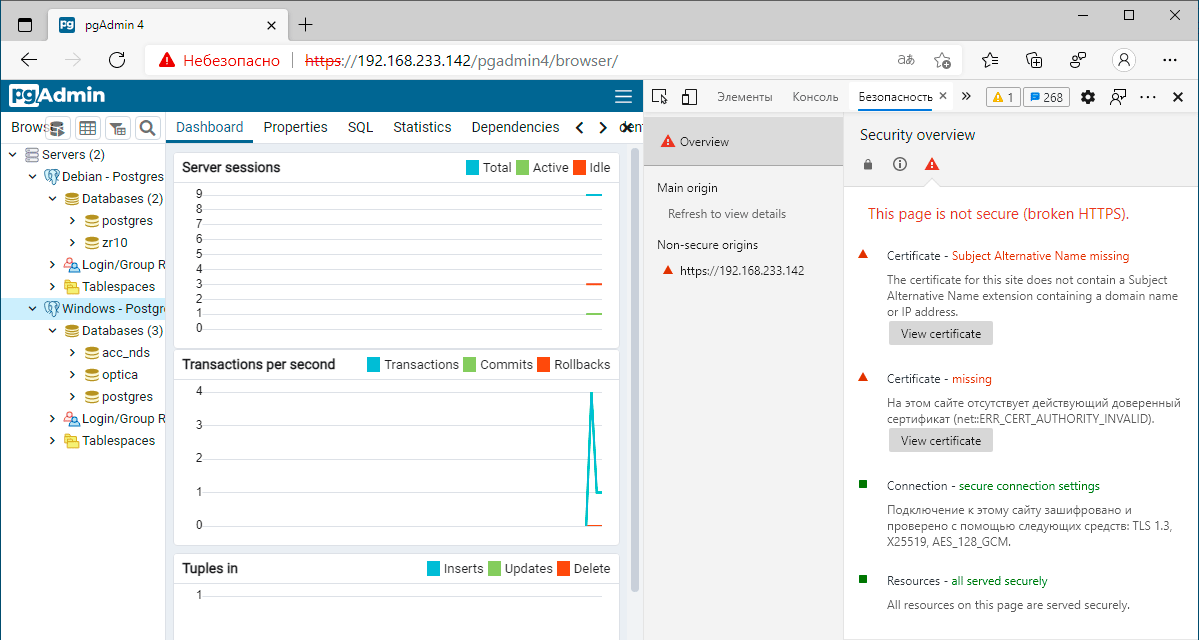 Вроде бы все хорошо, все настроено и работает. Но есть одно но! По умолчанию pgAdmin 4 работает по незащищенному протоколу HTTP, что в начале третьего десятилетия 21-го века неправильно, даже если вы работаете только в пределах локальной сети. Тем более что в случае несанкционированного доступа некто получит полный доступ ко всем вашим базам данных.