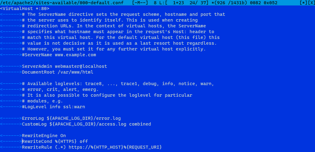 После того, как мы убедились, что наш сервер нормально работает по защищенному протоколу, настроим автоматическую переадресацию с HTTP на HTTPS. Откроем файл /etc/apache2/sites-available/000-default.conf и в пределах секции VirtualHost внесем следующие строки:
