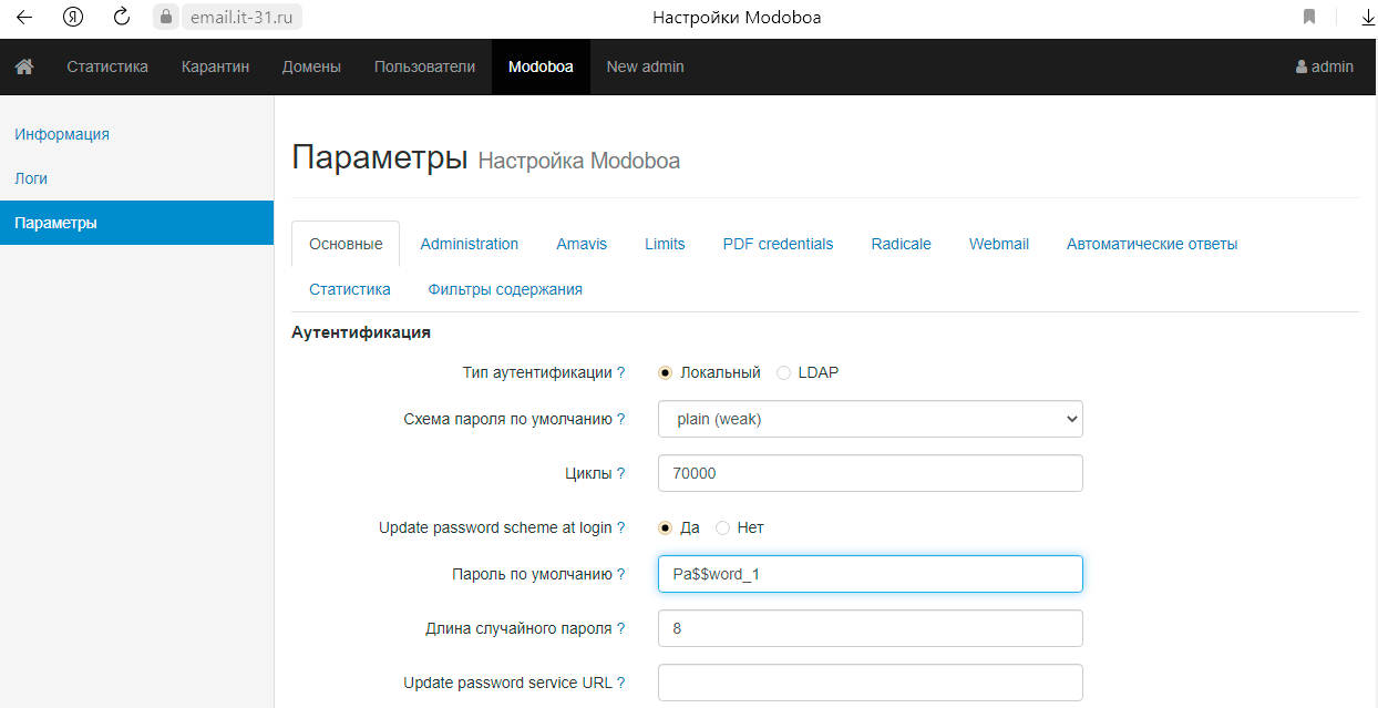 Теперь пробежимся по настройкам сервера, для этого перейдите в раздел Modoboa, настройки собраны по группам, что делает работу с ними более удобной. Настроек достаточно много, все они кратко прокомментированы, но начать придется с изменения пароля по умолчанию, потому что он не соответствует требованиям по уровню сложности и пока вы его не измените никакие другие настройки сохранить не получится.