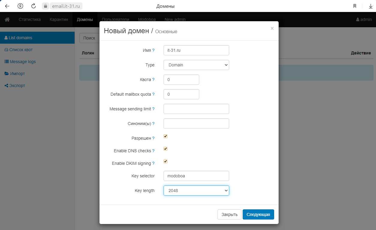 Следующим шагом будет создание почтового домена в разделе Домены, по умолчанию домен не создается. На страничке создания домена можно сразу задать квоты и лимиты, по умолчанию они не устанавливаются. Также обязательно установите флаг Enable DKIM signing и укажите селектор и длину ключа. Если это единственный сервер, то селектор можно оставить по умолчанию, если же серверов в домене несколько, то у каждого должен быть свой уникальный селектор ключа.