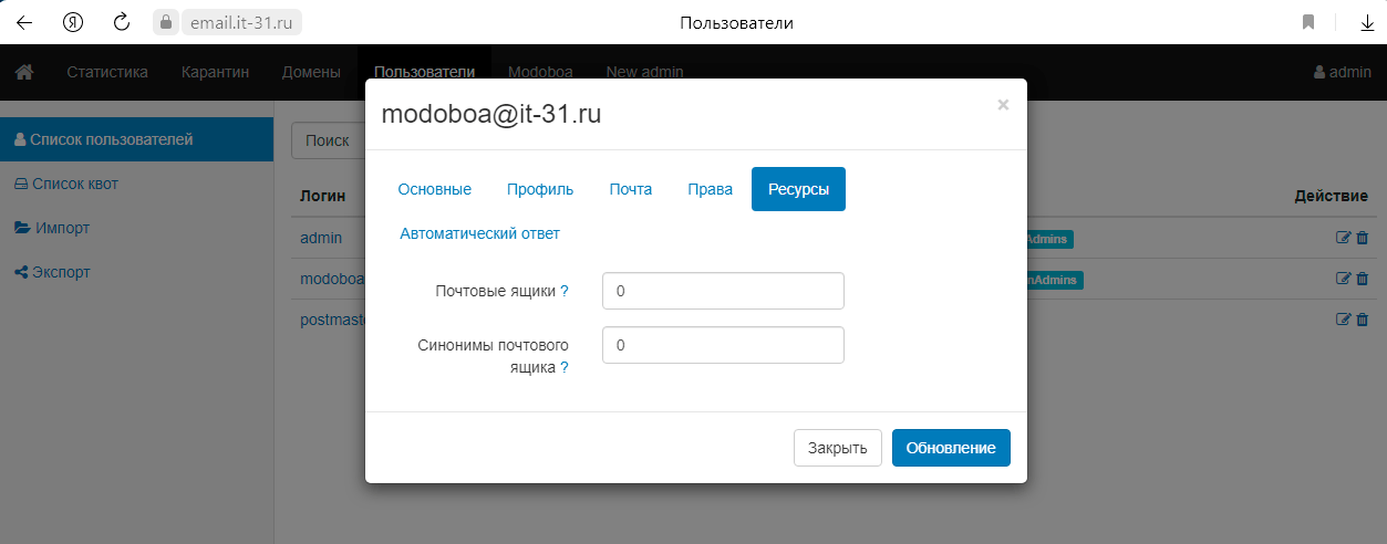 Сразу же после этого перейдите в раздел Пользователи, откройте настройки созданного администратора и на вкладке Ресурсы укажите количество доступных ему для создания ящиков и алиасов, для отключения лимитов установите значение как -1.