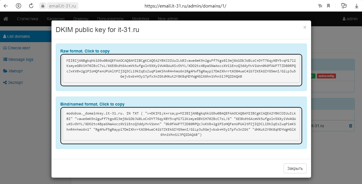 Откройте раздел Домены и перейдите к нужному домену и в информации о нем в строке DKIM key нажмите Show key.