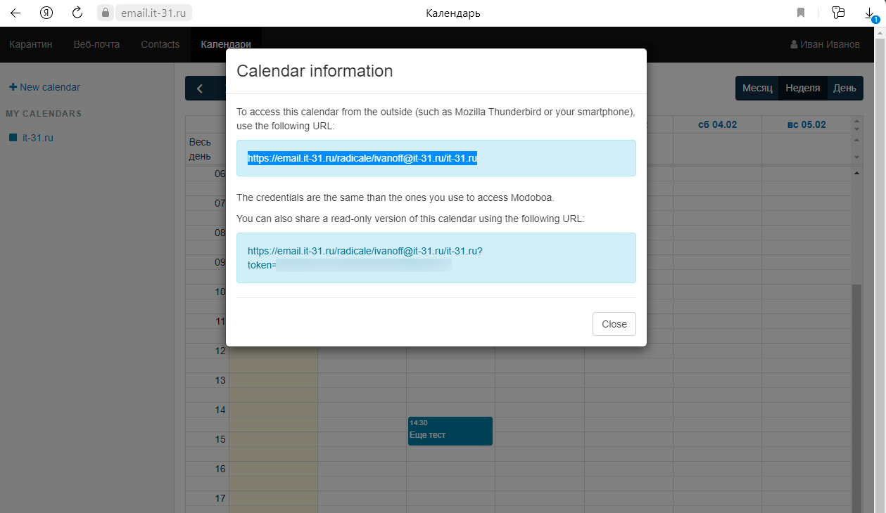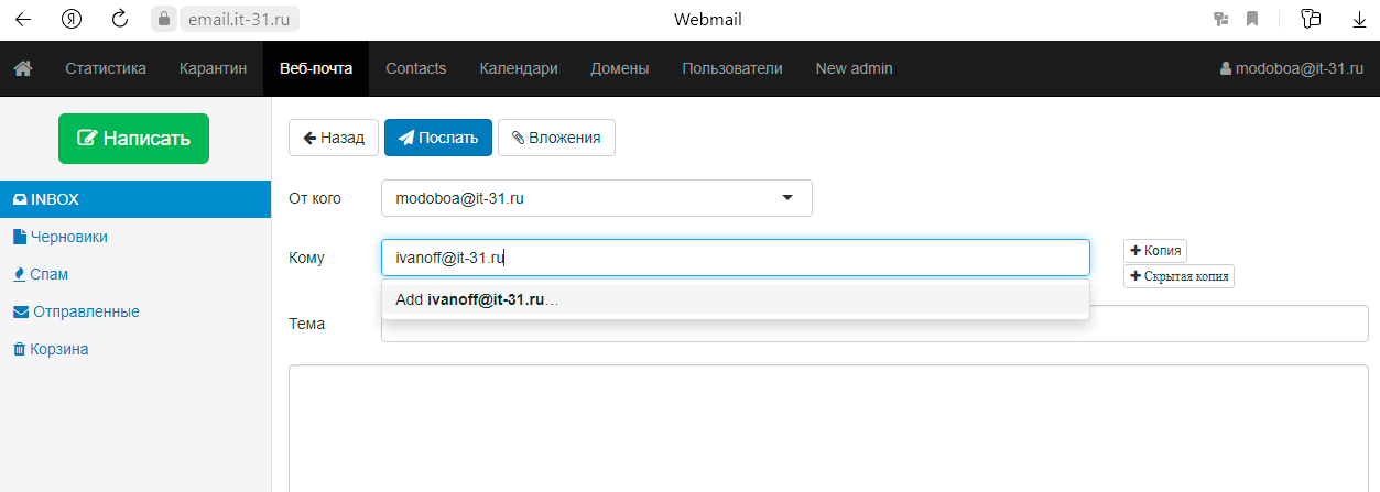 Начнем с веб-интерфейса, у Modoboa он свой и на первый взгляд закрывает все основные задачи: почта, адресная книга, календарь. Но сделан он откровенно неудобно, беден функционально и работает достаточно медленно. В общем пользоваться им можно только от безысходности. Но он есть и работает, для проверки сервера сгодится, которую мы начинаем с внутренней отправки.