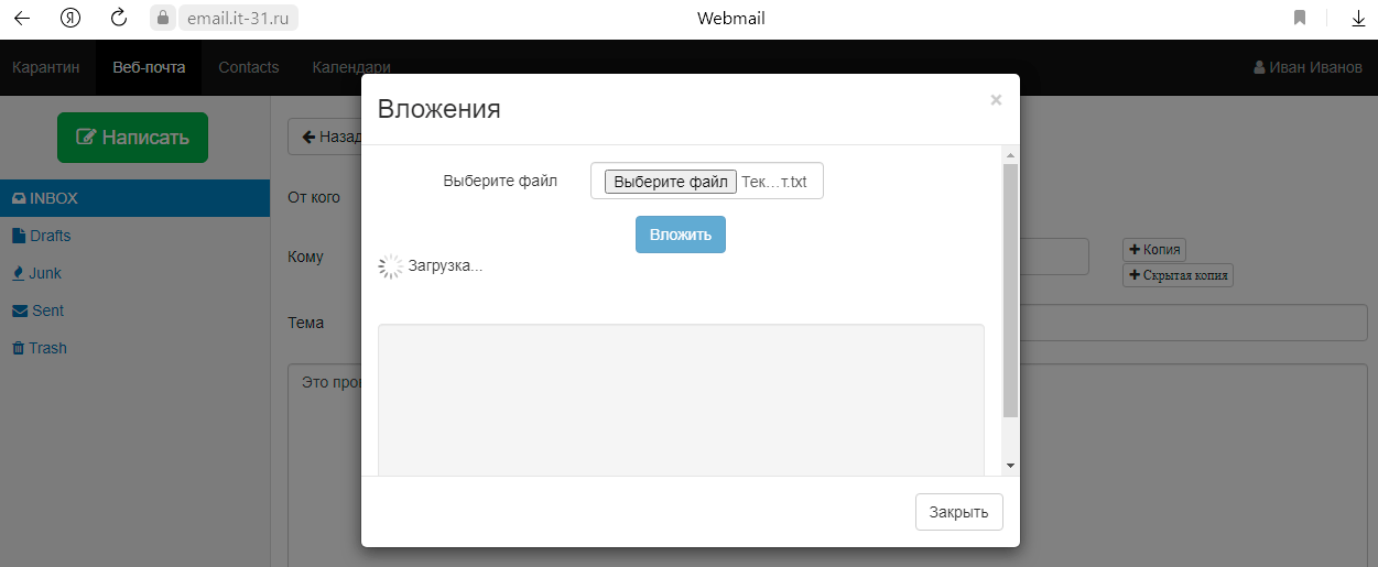 Если между своими ящиками почта бегает, то пробуем отправить почту внешним получателям. Здесь мы столкнулись с багом веб-интерфейса - невозможно прикрепить вложение, колесико крутится вечно и ничего не происходит.