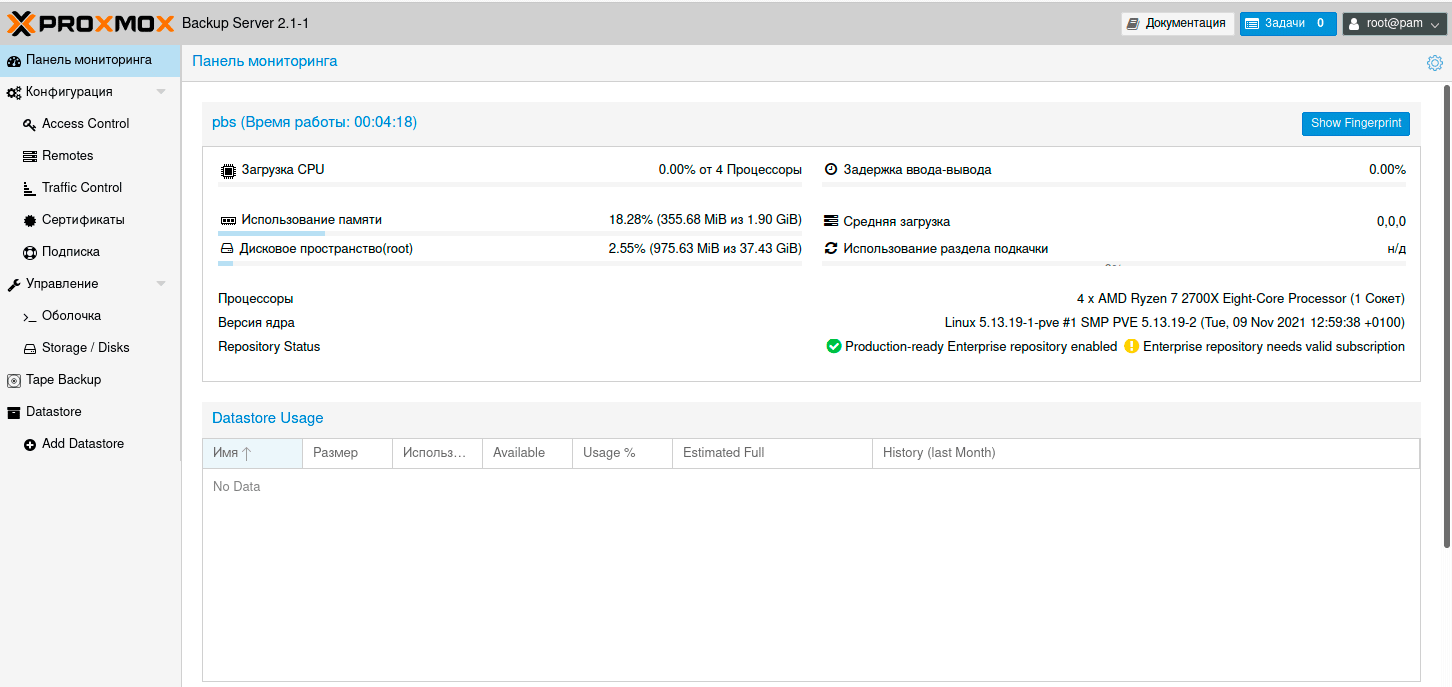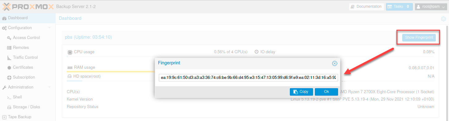 При подключении хранилища мы должны убедиться в подлинности сервера резервного копирования, это можно сделать различными способами, один из них - проверка отпечатка сертификата, который остается неизменным на весь период действия последнего и позволяет однозначно подтвердить его подлинность. Получить отпечаток можно перейдя в Панель мониторинга (Dashboard) Proxmox Backup Server и нажав в верхнем правом углу кнопку Show Fingerprint.