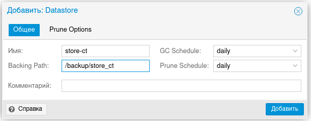 В нашем случае мы создадим два хранилища: одно для контейнеров с Linux, второе для виртуальных машин с Mikrotik CHR. Для того чтобы добавить хранилище выберем Add Datastore и заполним ряд необходимых полей: Name - имя хранилища, может быть произвольным, но желательно чтобы оно отражало содержимое хранилища, в дальнейшем имя будет использоваться как идентификатор хранилища, Backing Path - абсолютный путь к каталогу, в котором вы хотите создать хранилище, если путь не существует, то он будет создан. GC Schedule - периодичность выполнения сборки мусора, фактически выполняет задачу дедупликации, Prune Schedule - периодичность очистки хранилища от устаревших резервных копий.