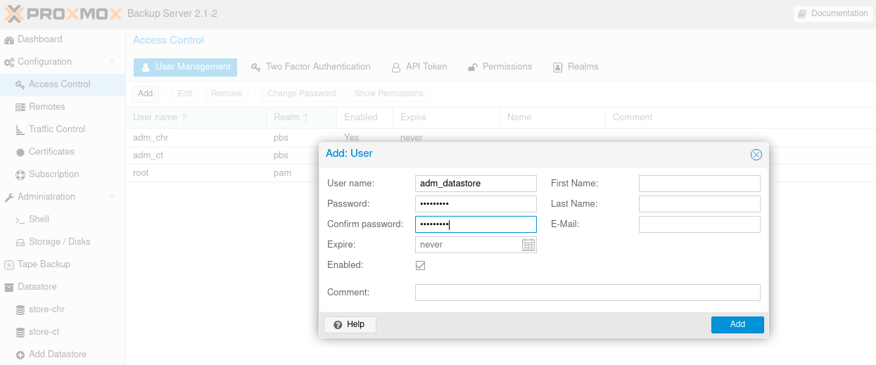 Поэтому кроме разделения данных по разным хранилищам также следует настроить различные права доступа к ним. Proxmox Backup Server поддерживает две области аутентификации (Realms): стандартную Linux PAM, которая включает системных пользователей и pbs - область аутентификации Backup Server, этот тип пользователей не регистрируется в системе и не может войти в нее, а существует только в пределах сервера резервного копирования, что обеспечивает более высокую степень безопасности.