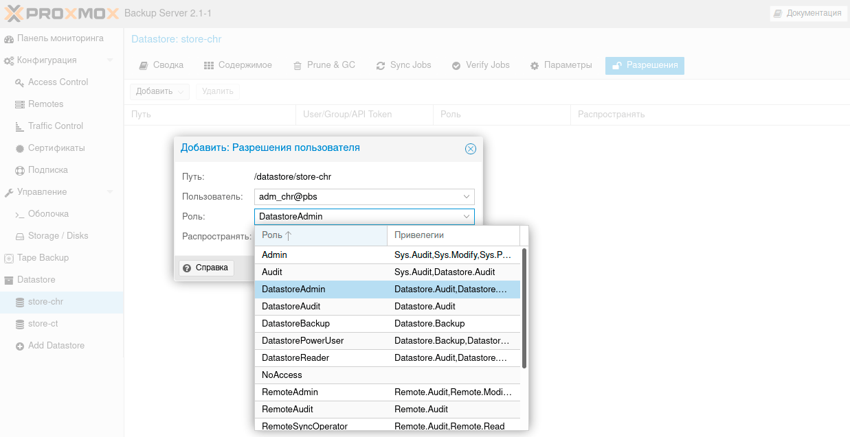Обратите внимание, что все создаваемые при помощи веб-интерфейса пользователи будут включены в область аутентификации pbs, если вам нужен пользователь с областью аутентификации pam - его следует создать средствами операционной системы. По умолчанию пользователям не назначаются никакие права, это нужно сделать самостоятельно, для этого можно воспользоваться вкладкой Permissions, но если мы хотим задать права доступа к хранилищам, то удобнее пойти другим путем.