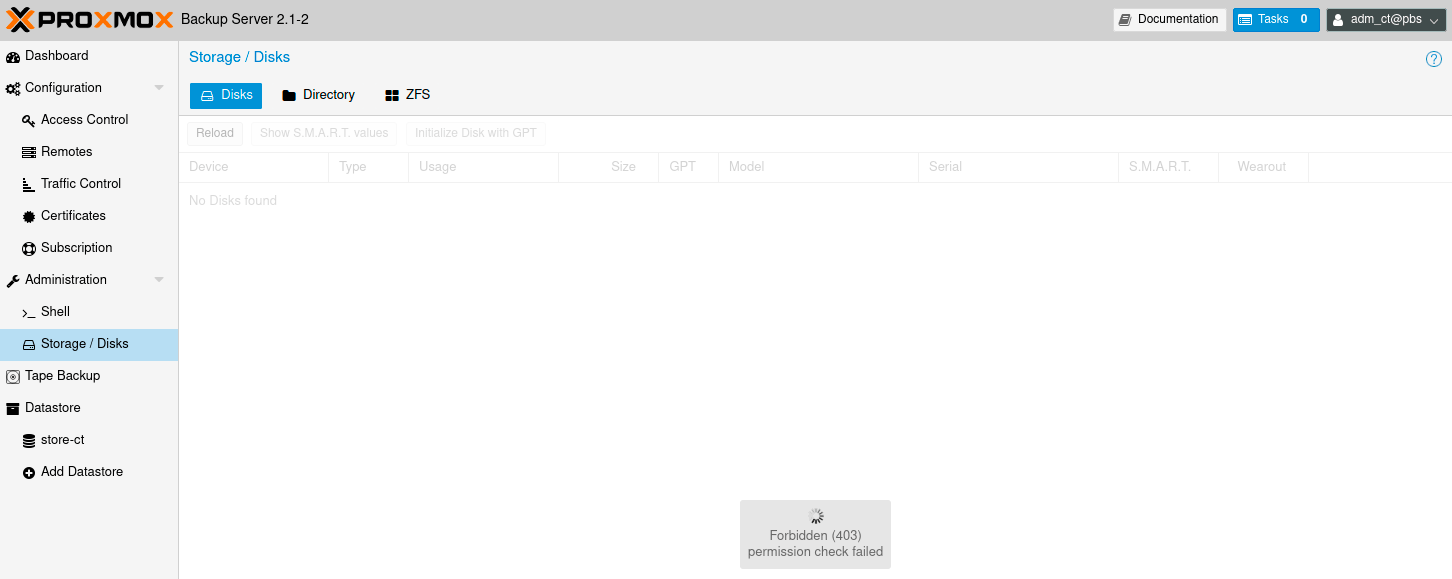 Для примера выполним вход пользователем, для которого мы указали роль DatastoreAdmin, он будет иметь доступ только к собственному хранилищу и будет иметь возможность создать новое хранилище, также для него существует возможность создавать новых пользователей и выдавать им права на те объекты, которые ему доступны. Доступа к настройкам других пользователей или системы он не имеет, а при попытке получить доступ ему будет выведено сообщение об ошибке 403 Forbidden.
