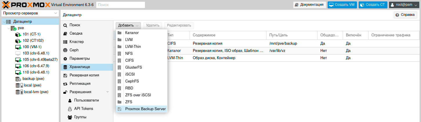 Для подключения перейдем на уровень Датацентр - Хранилища - Добавить и в выпадающем списке выберем Proxmox Backup Server.