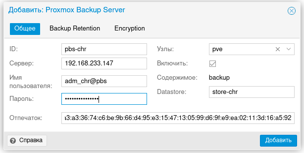 Диалог добавления в целом понятен: указываем идентификатор хранилища, его можем выбрать произвольно, но желательно задавать осмысленные имена, адрес сервера можно указать как по IP, так и по FQDN, имя пользователя с обязательным указанием области аутентификации, т.е. root@pam или user_1@pbs, в поле Datastore указываем идентификатор хранилища, к которому подключаемся. Отдельного разговора заслуживает поле Отпечаток, о нем ниже.