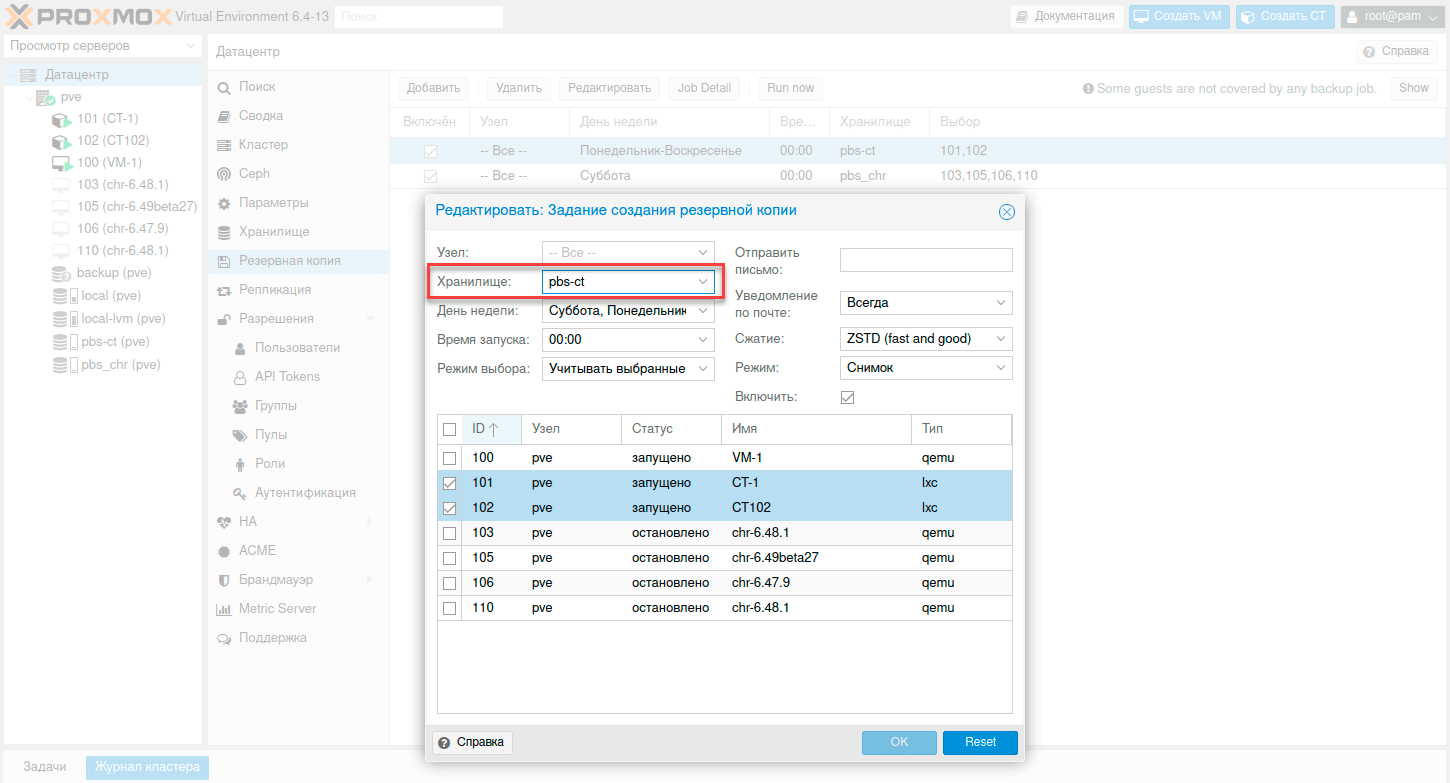Если все сделано правильно, то хранилище будет добавлено в список доступных для этого датацентра (или отдельной ноды, если при подключении вы указали ограничения в поле Узлы) и его можно использовать для настройки резервного копирования штатными средствами. Если у вас есть уже настроенные задания то их можно легко перенаправить на Proxmox Backup Server просто изменив хранилище в настройках.