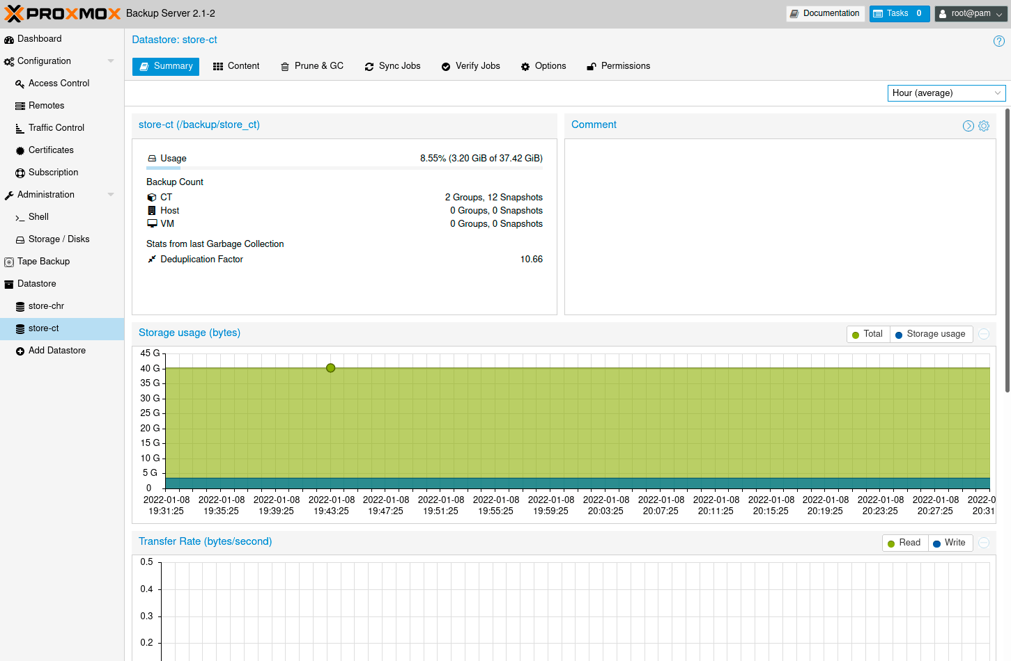 Теперь, когда мы все настроили и проверили самое время посмотреть какие возможности предоставляет Proxmox Backup Server и ради чего все это затевалось. Начнем со статистики, она ведется для каждого хранилища и показывает не только объем занятого пространства, но и скорости обмена с дисками, количество и задержки операций ввода-вывода, что очень важно, так как позволяет непосредственно контролировать производительность хранилища, понимать и избегать узких мест.