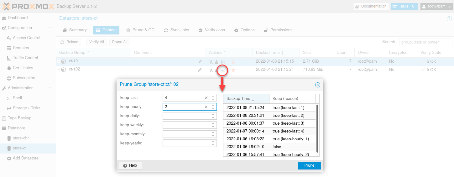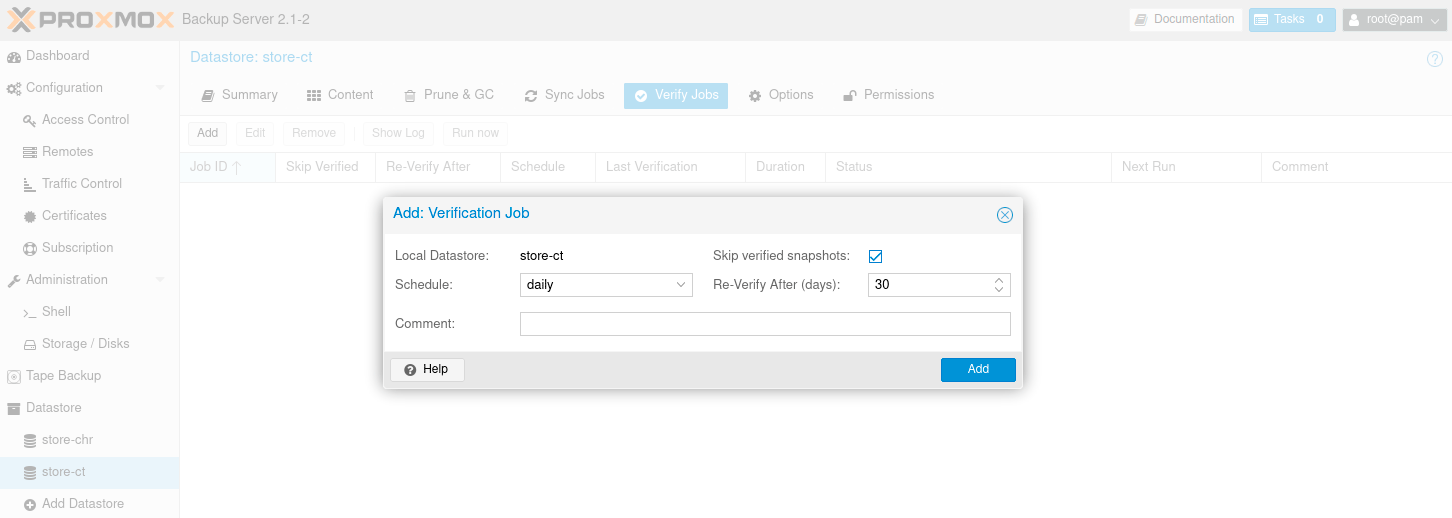 Proxmox Backup Server позволяет эффективно избегать подобных ситуаций, для этого вместе с каждой резервной копией создается файл-манифест index.json который содержит контрольные суммы для каждого файла резервной копии, а процесс верификации заново вычисляет контрольные суммы хранящихся файлов и сравнивает их с манифестом, если они совпали - то копия является целостной. Такие проверки следует выполнять регулярно и настроить их можно на вкладке Verify Jobs, настройки по умолчанию подразумевают ежедневную верификацию и повторную проверку верифицированных копий раз в месяц, что позволить вовремя выявить проблемы с отказом устройств хранения или возникновения ошибок на них.