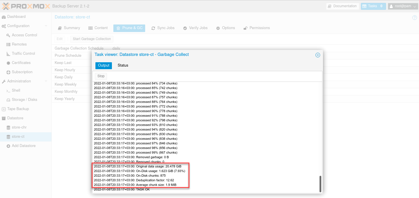 Следующая вкладка Prune & GC отвечает за очистку и сборку мусора. Про очистку сказано достаточно, поэтому остановимся на последней операции. Сборка мусора представляет собой процесс дедупликации, в это время анализируется содержимое, общие блоки помещаются в специальное хранилище и заменяются ссылками на них. Процесс достаточно ресурсоемкий, в первую очередь вызывающий большую нагрузку на диски, поэтому следует его выполнять в то время, когда не предполагается активных задач по резервному копированию, по умолчанию он запускается раз в сутки. Также можно запустить данный процесс вручную, вывод задачи также содержит статистику, позволяющую оценить эффективность дедупликации.