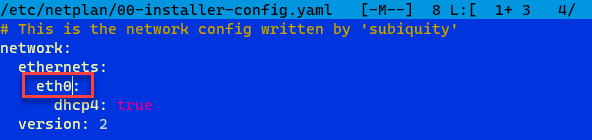 Естественно, что такой вариант является нежелательным, поэтому предпримем некоторые меры. Прежде всего откроем файл /etc/netplan/00-installer-config.yaml и заменим в нем имя интерфейса на eth0.