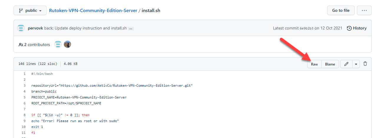 Перейдем в домашнюю папку и скачаем туда скрипт для установки Рутокен VPN с официального репозитория на Github. Чтобы узнать ссылку на скачивание файла в Github перейдите к нему и нажмите кнопку Raw вверху окна, после чего скопируйте прямой адрес из открывшейся вкладки.