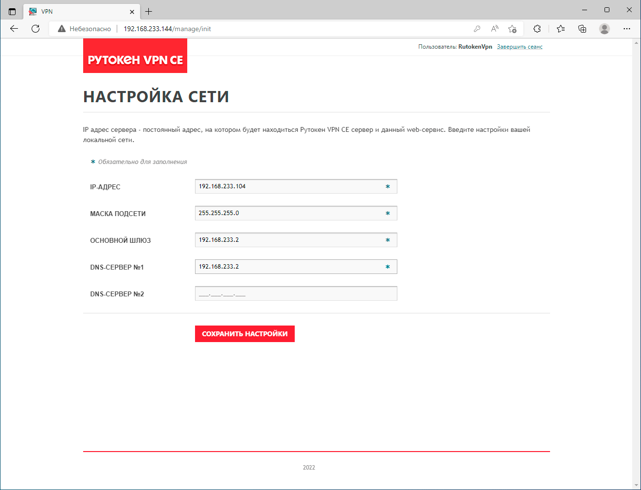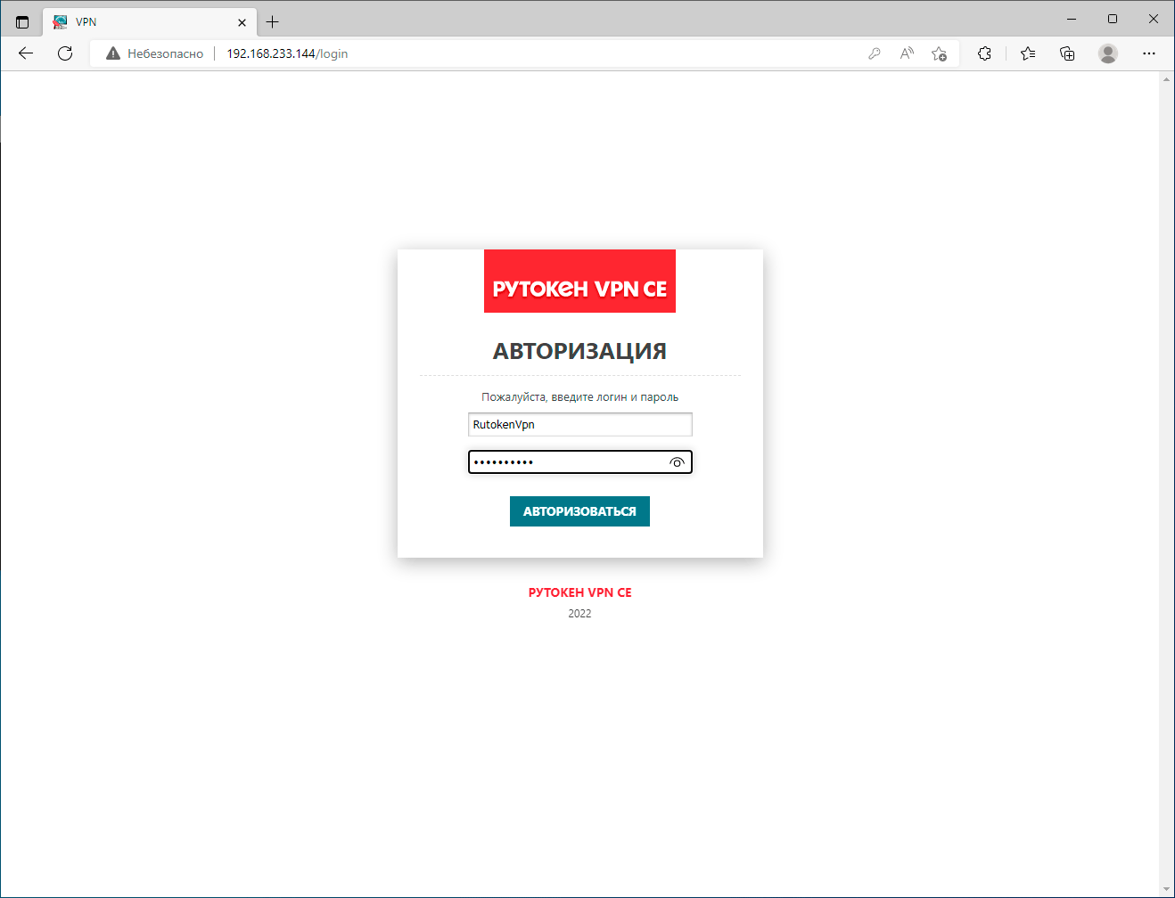 Чтобы получить доступ к панели управления Рутокен VPN наберите в браузере адрес http://IP_ADDRESS, где IP_ADDRESS - текущий IP-адрес сервера. В качестве логина и пароля используйте RutokenVpn.