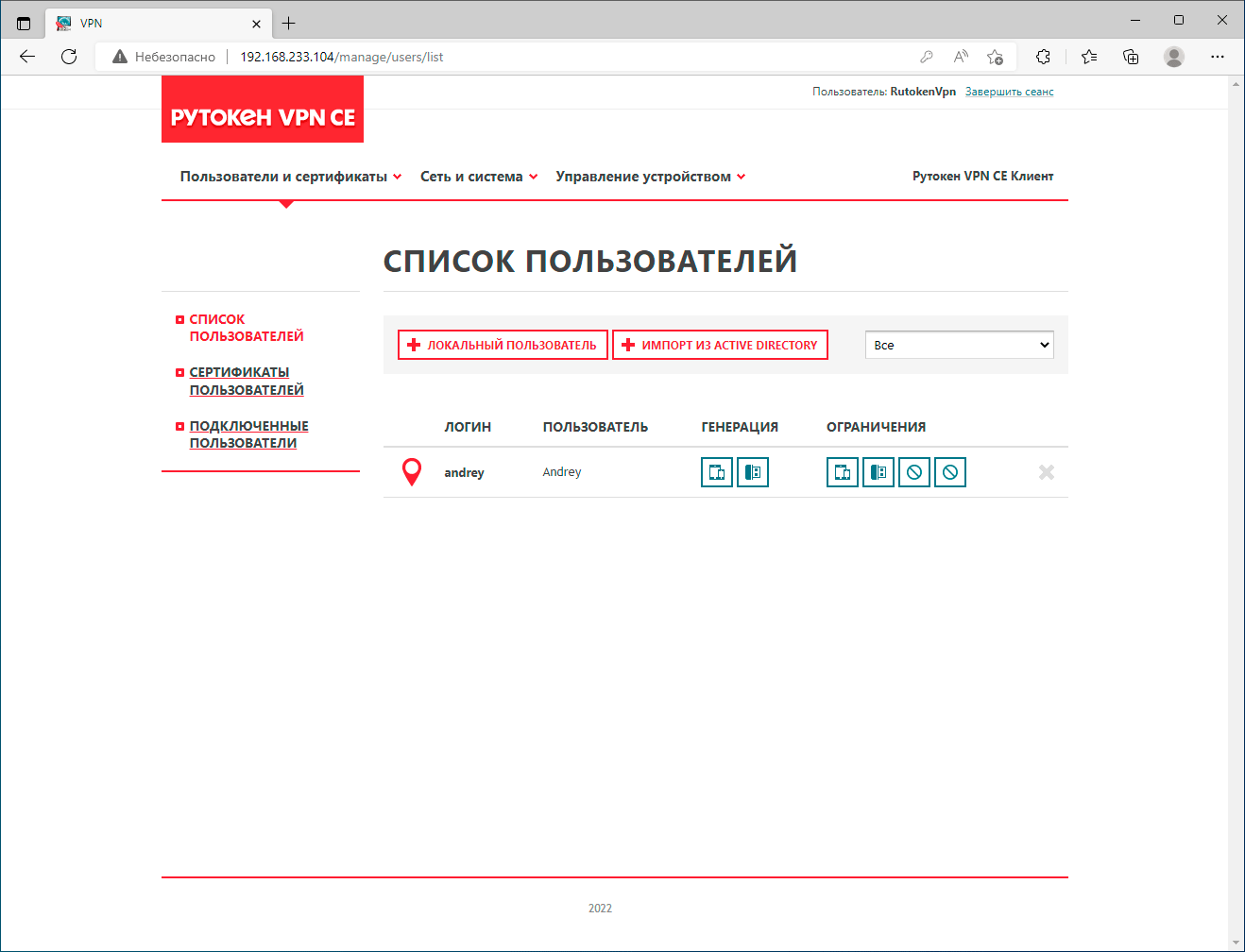 В дальнейшем, входя в панель управления мы будем сразу попадать в раздел Пользователи и сертификаты, где мы можем как создавать пользователей вручную, так и импортировать их из ActiveDirectory, что удобно если вы используете данную службу каталогов. Прямо из списка пользователей можно выпустить сертификаты и установить ограничения.