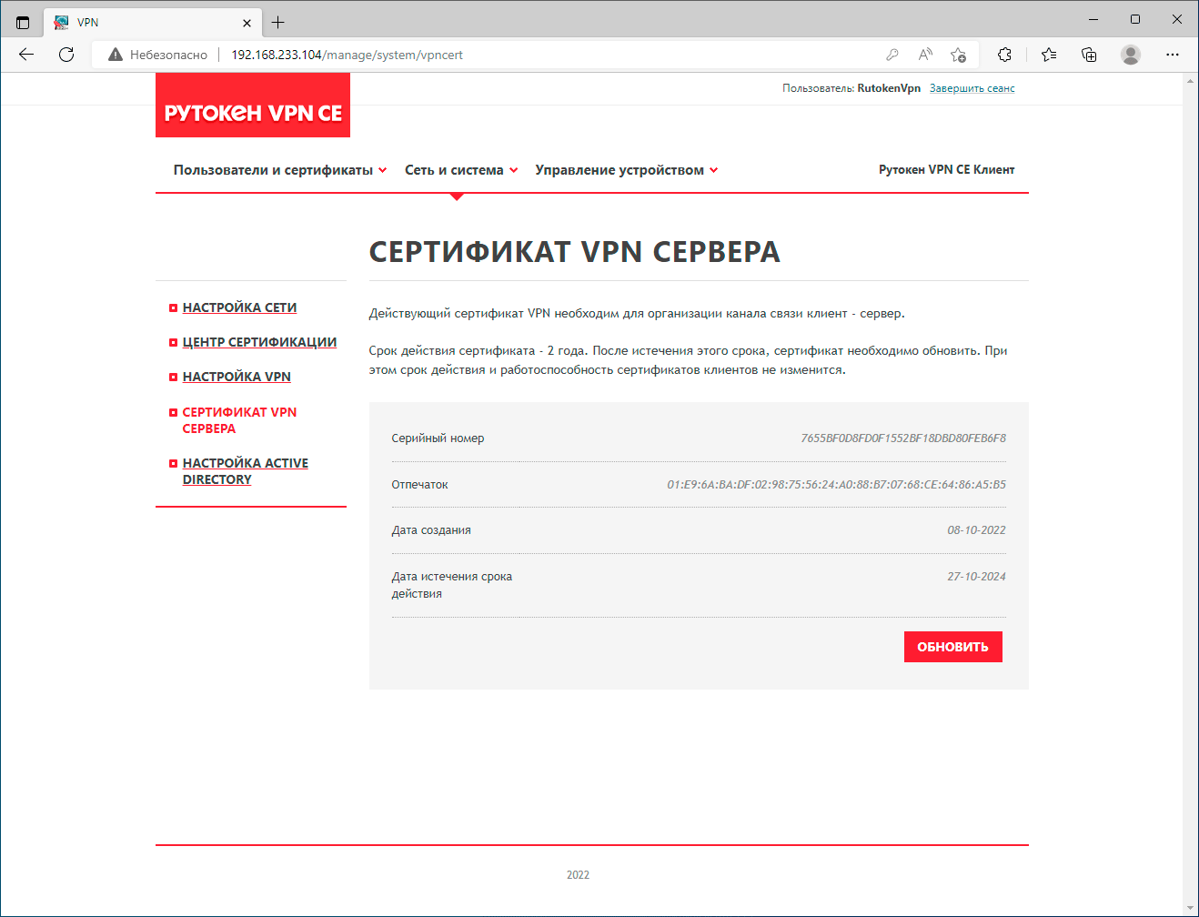 В разделе Сеть и система находятся настройки сети, центра сертификации и самого VPN-сервера которые мы уже видели, настроек немного и делать там, в общем и целом, нечего. Здесь же можно перевыпустить сертификат сервера, который выдается по умолчанию на два года. Срок действия сертификата пользователя также 2 года.