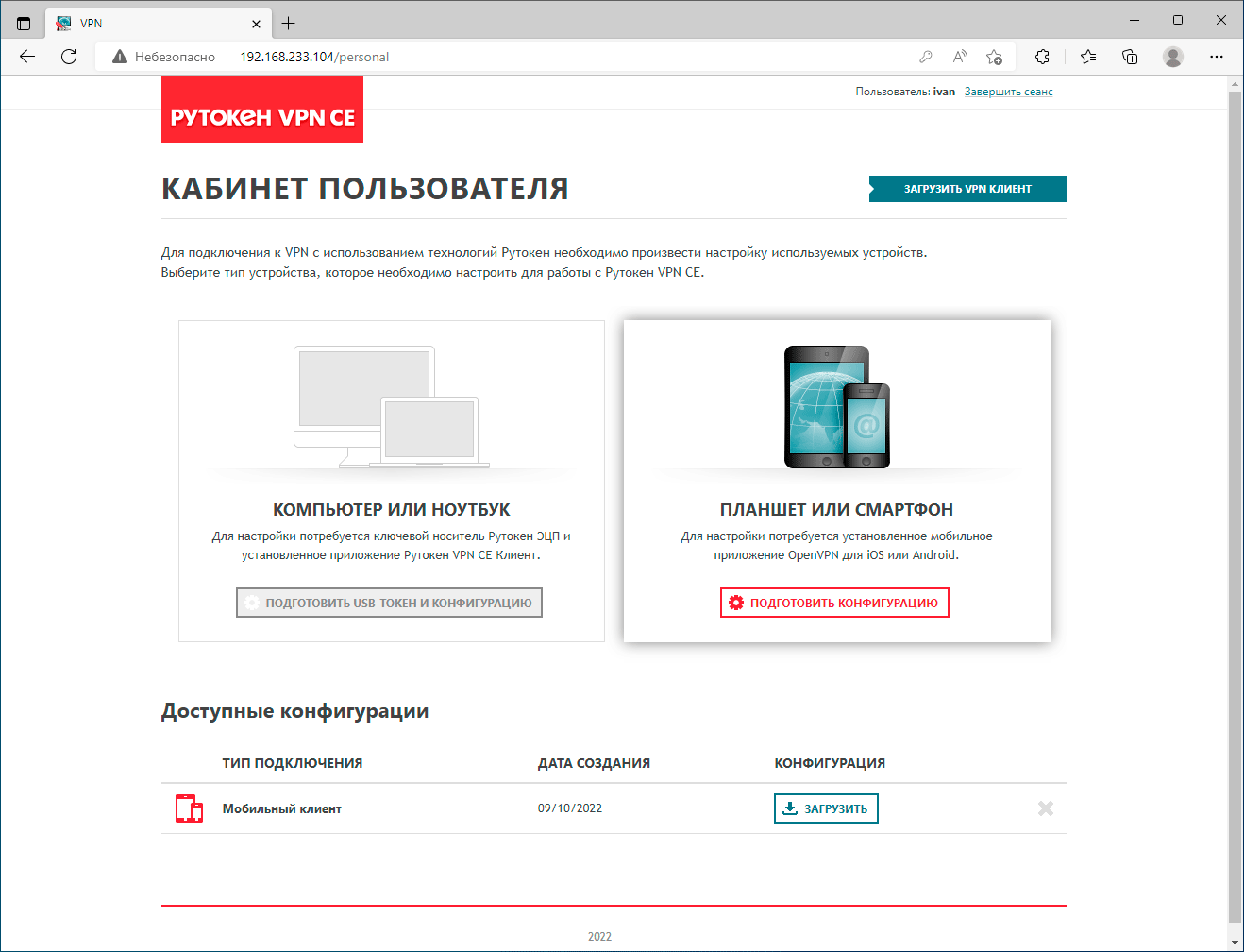 С административной частью продукта мы ознакомились, теперь перейдем к клиентской, каждый пользователь, если у него не стоит явный запрет, имеет доступ в личный кабинет, где ему доступны собственные конфигурации VPN, а также возможность создать их самостоятельно. Это очень полезная возможность, снижающая нагрузку на администраторов и повышающая удобство использования системы пользователями.