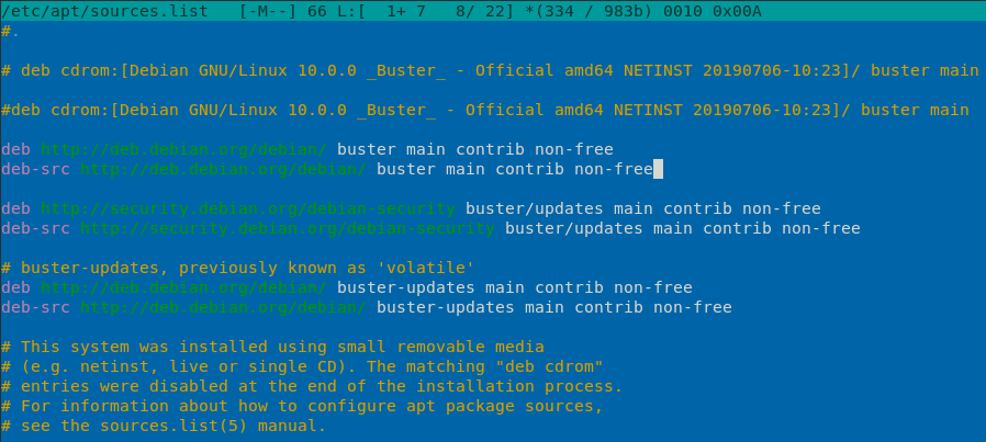 Начнем с репозиториев. В Debian прежде всего подключим разделы с несвободным ПО, для этого откроем /etc/apt/sources.list и добавим после main в каждую строку contrib и non-free.