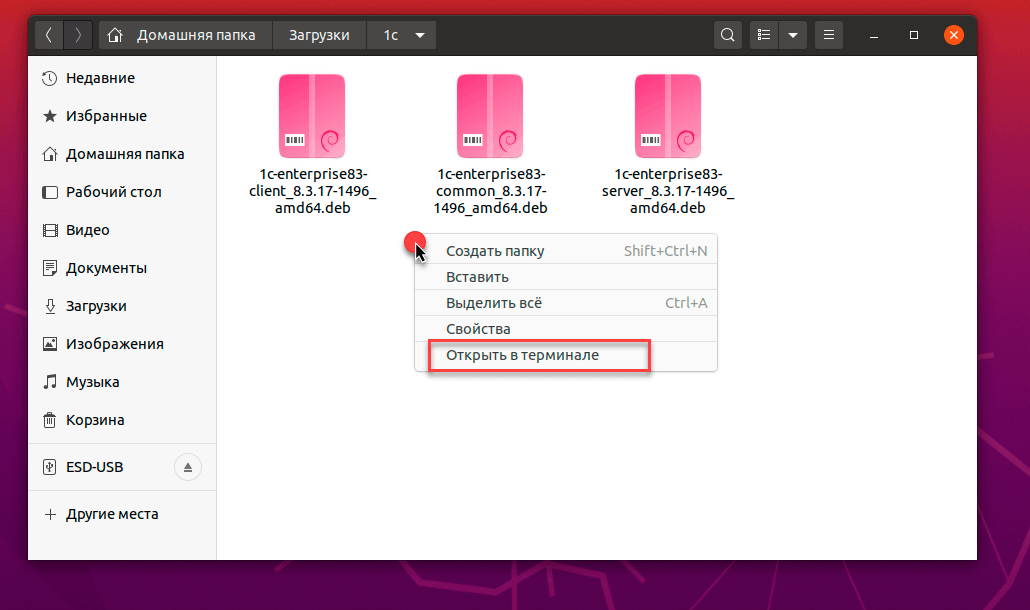 Создадим отдельную папку и скопируем туда пакеты client, common и server, а также, при необходимости, nls-пакеты. Затем снова перейдем в терминал, для этого в меню правой кнопки мыши выберите Открыть в терминале.