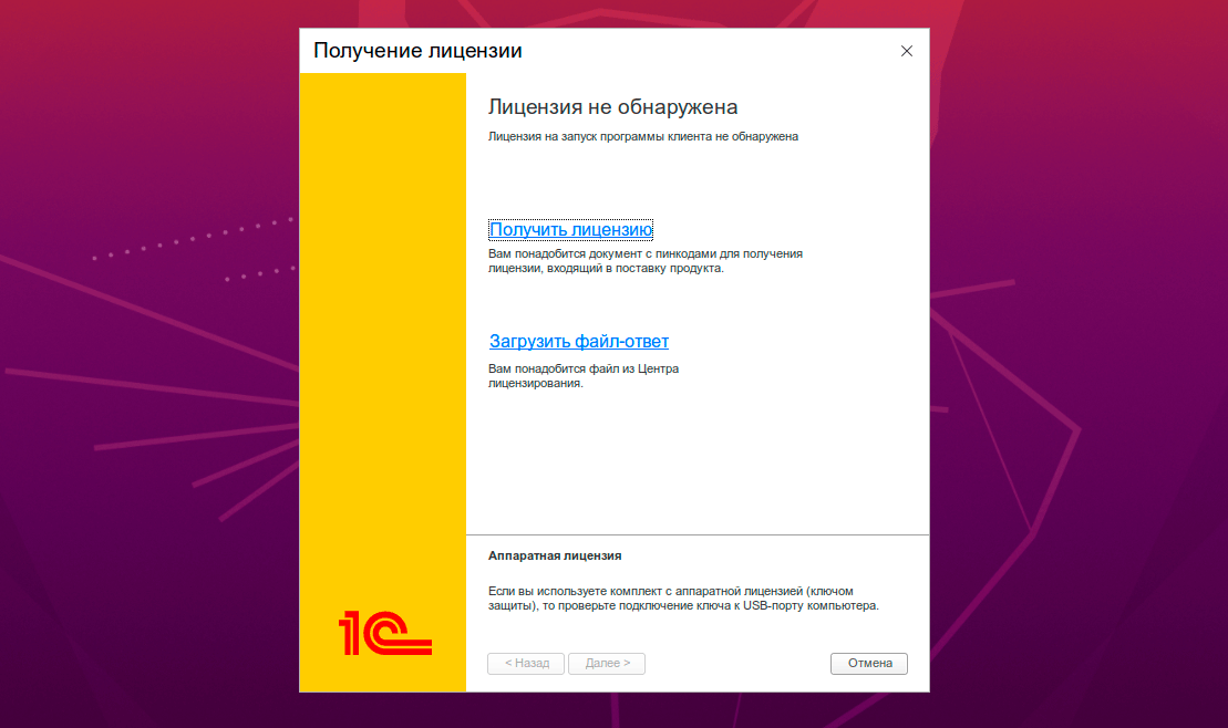 После чего можем попробовать запустить 1С с ярлыка в системе. В 8.3.17 при отсутствии лицензии платформа, как и в Windows, предложит вам выполнить получение лицензии.