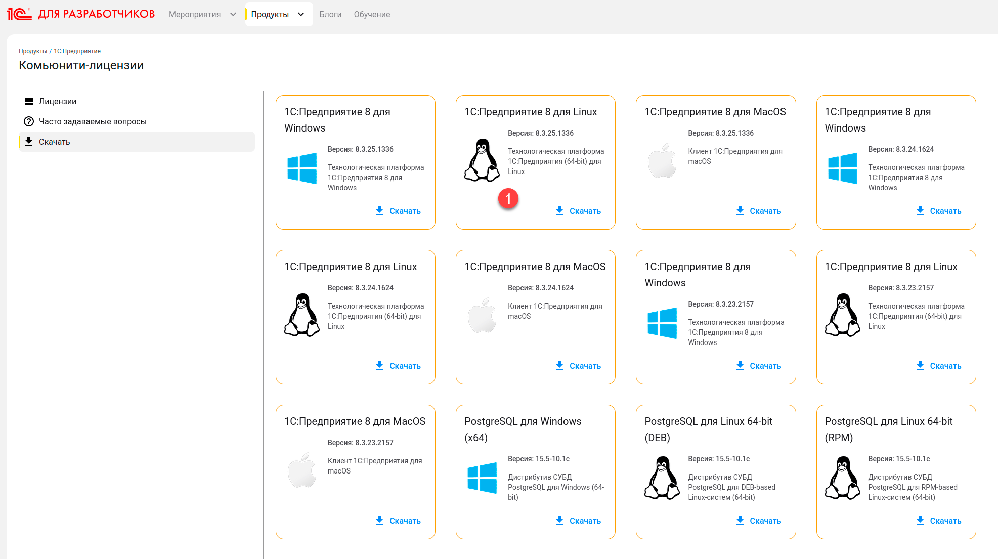 Для получения набора для разработчика вам нужно зарегистрироваться на портале 1С для разработчиков, после чего вам будет доступна комьюнити-лицензия и дистрибутивы для установки платформы 1С:Предприятие и СУБД PostgreSQL. Если быть честными, то вы можете взять любую платформу версии 8.3.23 и старше, а также любую совместимую с 1С версию СУБД, но мы исходим из того, что у пользователя пока ничего этого нет и поэтому будем ориентироваться на легальные пути получения дистрибутивов.