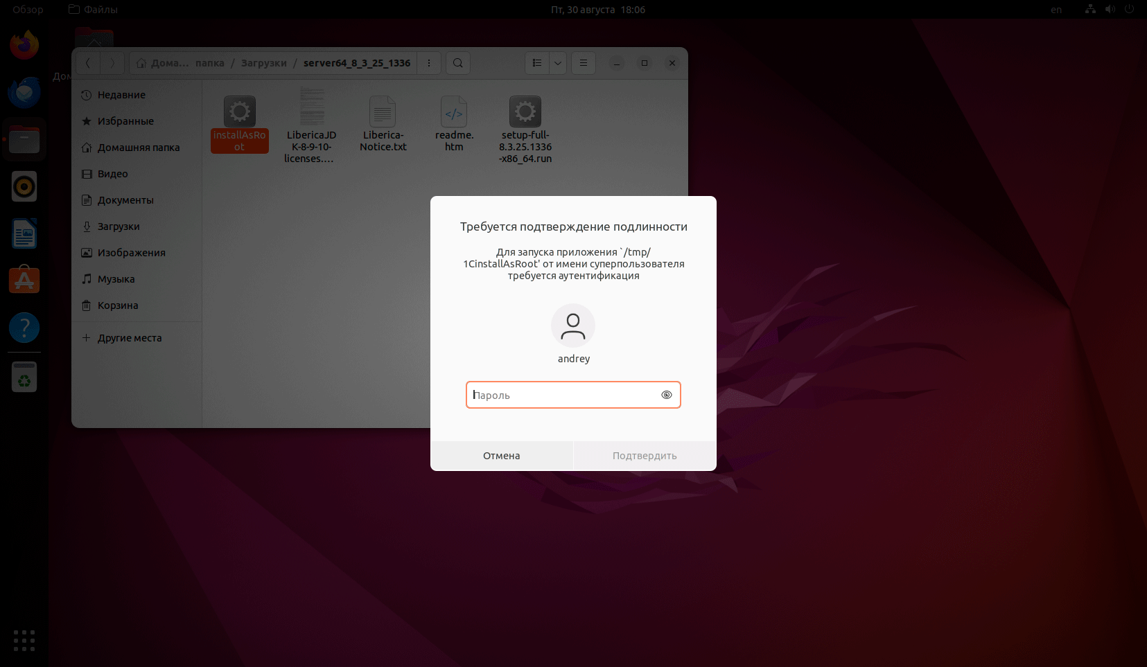 Скачиваем и распаковываем архив с платформой и запускаем находящийся там бинарный файл InstallAsRoot, который запустит установку с правами суперпользователя root (самый главный администратор в Linux). Перед этим потребуется подтвердить повышение прав.